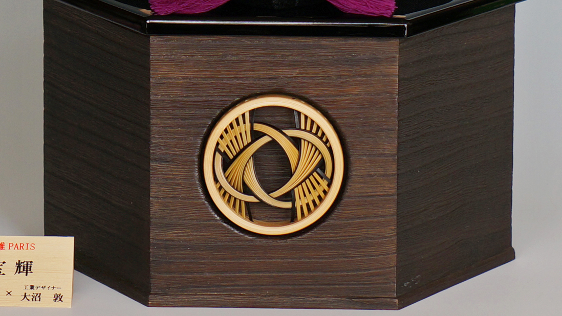 焼き桐飾り台の前面には、固い絆で結ばれることを意味する「あわじ結び」の駿河竹千筋細工がはめられています。親子の絆、家族の絆を大切にしてほしいという願いを込めました。