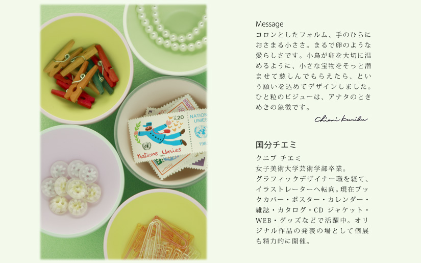 新しいブランド「ebaco」では、これからも出来る限りクリエーター国分チエミとしての感性を大事にして、作品づくりを行っていきたいと考えている。そうすることで誕生した作品はその内面にストーリーを感じることができ、唯一無二の存在になることができると思う。