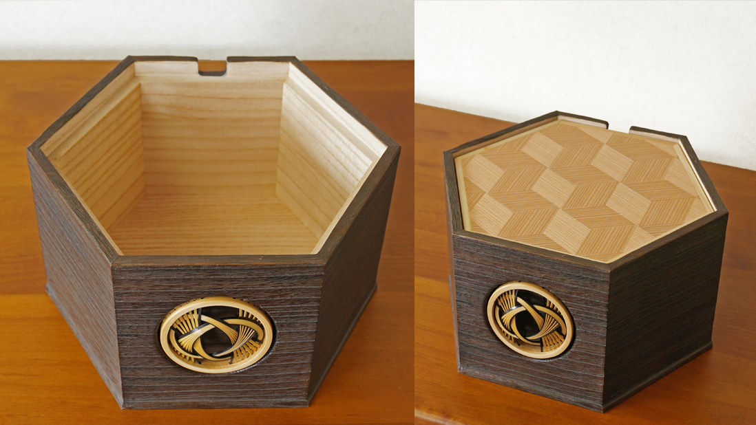 焼き桐飾り台の前面には、固い絆で結ばれることを意味する「あわじ結び」の駿河竹千筋細工がはめられています。親子の絆、家族の絆を大切にしてほしいという願いを込めました。